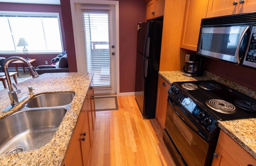 This two-bedroom condo comfortably sleeps 5 adults in the bedrooms and up to 6 adults including the sleeper sofa in the living room. Featuring 2 queen beds, 1 single bed and a pull-out sofa bed, you will be more than comfortable. This chalet is perfect for couples or families. With a one car garage, keep your vehicle, snowboards, ski’s and/or mountain bikes safe and secure during your stay. Access the unit through an exterior breezeway.