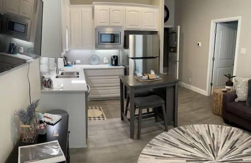 This relaxing suite w/private patio is truly one of a kind. Great place to stay when traveling for work, visiting family, attending a wedding or just to relax and get away! Close to hospitals and Aledo High too! Delightful and super clean 1-bedroom Apartment like suite (attached to occupied house) with private entrance and fenced in patio with private hot tub space. Parking on-site with walking access to the Morningstar Lake. On-site washer and dryer with walk-in closet. Quaint workspace for those who need to work while traveling. Quick drive to Downtown Ft. Worth or Weatherford. Suite comes equipped w/coffee maker, air fryer, crockpot, iron, steamer and dishes, blankets and towels. On-site WiFi with Smart TV.