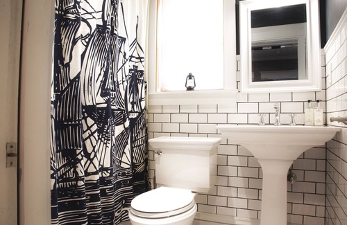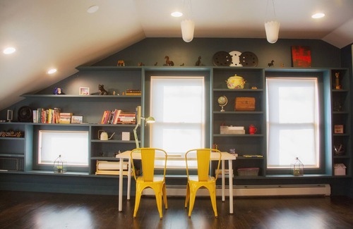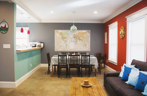 The second floor has 2 sleeping spaces, a full bathroom, and a work space. One bedroom has a king size bed plus a twin day-bed with a twin trundle for kids. The rest of the upstairs is an open space with two full-size beds, plus a small pull-out couch, and a desk is located in front of the window with a nice view of the backyard. (Please note that this bedroom does not have a door, but is separated from the other bedroom by the staircase. Sound does travel between the 2 rooms.) You'll find lots of books and kids' toys upstairs as well, along with a full bathroom with a soothing claw-foot tub/shower.