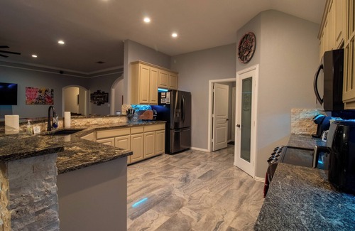 The Game room has 6 ceiling speakers you can either connect to the TV or your phone, along with plenty of games including a pool table, foosball, table hockey, giant jenga, connect four, ladder toss, cornhole, darts, etc. There are also 2 pool speakers you can connect to by Bluetooth Outdoor PyleUSA. There are 4 refrigerators available for use. One full sized refrigerator with a freezer, one mini fridge by back door, one in the outdoor kitchen, and another in the Tiki bar you can use to store your refreshments. There is an outdoor kitchen you can use to cook. Stovetop burners, propane grill, Blackstone, and offset smoker. Please clean and turn off propane after use.