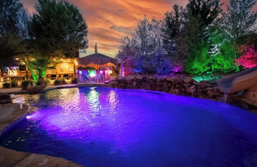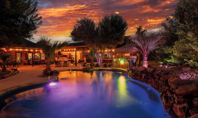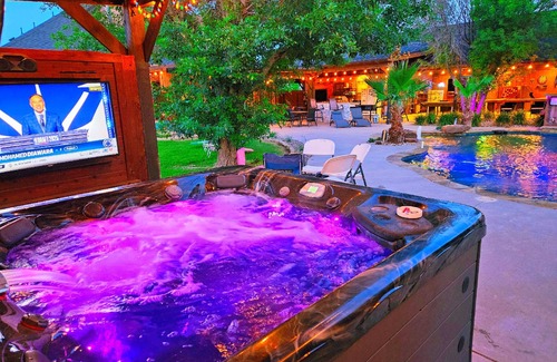 Huge swimming pool with a stone waterfall, water slide, water volleyball, water basketball, pool toys, tanning ledge, two pool lounge chairs for sunbathing, pool lights, palm trees and beautiful landscaping surrounding. A 6 person hot tub with lounger and color changing lights with a TV and firepit nearby. Huge covered patios with ceiling fans and roll down shades to escape the heat. Color changing landscape lighting and string lighting at night. A TIki bar with mini fridge and bar stools by the pool. Dedicated outhouse bathroom by the pool with a sink, urinal, and new toilet. 4 outdoor TVs with all Dish channels. DISH offers more than 330 channels, including local networks, regional and national sports, premium movie channels and more. You may also log into your account on Netflix or Amazon Prime. There are two surround sound systems that you can connect to by Bluetooth. Outdoor Polk Sound Bar has a Front sound bar, 4 rear speakers, and one subwoofer.