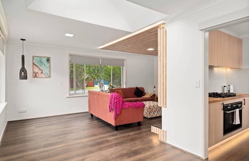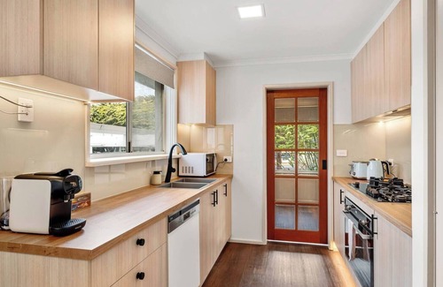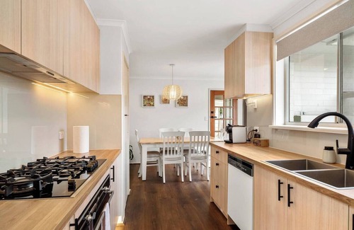 The fully equipped kitchen in this family-friendly cottage is designed for both functionality and style. It features a stunning timber benchtop that adds warmth and character to the space. The kitchen is outfitted with modern appliances, including a cooktop, oven, dishwasher, toaster, coffee maker, and kettle, ensuring you have everything you need for meal preparation. It is also stocked with basic utensils, cookware, and kitchenware, making it easy to prepare everything from quick snacks to family meals. Whether you're cooking a gourmet dinner or enjoying a casual breakfast, this kitchen offers all the convenience and comfort you need. Adjoining the Kitchen is the dining area of the cottage & it features a stylish 6-seater oak dining table, providing a warm and inviting space for family meals and gatherings. The rich oak wood enhances the room’s natural charm, while a beautiful pendant light above the table adds a touch of elegance and ambiance, creating the perfect setting for both casual and special occasions.