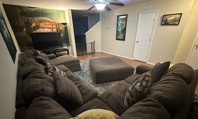 Forget your worries in this spacious and serene space. The house is located in west Fort Worth near two major highways, which will make it easy to go anywhere in DFW. The backyard is massive and depending on the season, it might have fruit falling off trees. Living room has a massive couch setup. A hammock is set up upstairs. The master bedroom is extremely large and so is the master bathroom attached to it. All beds are extremely comfortable and an extra inflatable bed will be available.