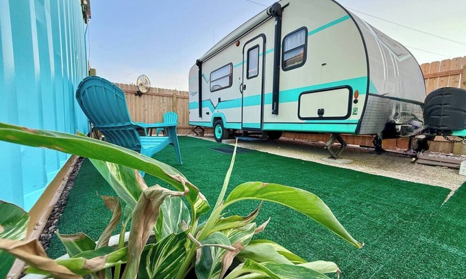 The camper sits inside a private, fenced-in yard with comfy patio chairs and a table, plus a lockable gate for your peace of mind. There is gravel parking lot outside the gate with free parking. When you’re ready to explore, the bar next door is a great spot to hang out. The coffee trailer opens bright and early at 7 AM, and the bar welcomes guests from noon until 2 AM (21+ after 8 PM).