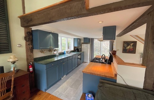 A comfortable home with books, games, a smart TV, high speed internet, outdoor access to farm property, sauna, miles of hiking and mountain bike (Ridgeline) trails, and nearby river and swimming holes make the Guest House an ideal couples or family getaway. A "loft" bedroom space adjacent to the main bedroom is a fun hang-out for kids of any age. The downstairs sofa pulls out to a queen sleeper. Details like goose down pillows, warm throw blankets, and a collection of books create a cozy, home-like stay. The kitchen is fully equipped and has a gas stove and dishwasher. Laundry facilities are upstairs in the walk-in closet. Brochures and recommendations for local New England attractions and activities are provided.