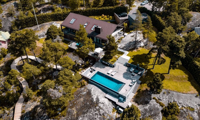 This luxury villa bathes in light and has a fantastic panoramic view over the Stockholm archipelago. Enjoy your evening drink by the infinity pool at sunset watching the archipelago boats pass through Höggarns Bay. From here you will reach Strandvägen in central Stockholm in 8 minutes by yacht.