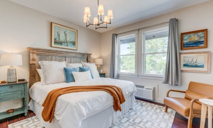 Come rest in peaceful waters. Harbor Haven's decor brings in nautical assets with lovely framed oil paintings of ships evoking a sense of maritime adventure and timeless elegance. A round mirror mimics a boat's porthole. A quote by E.E. Cummings, "For whatever we lose like a you or a me, it's always our self we find in the sea," adds a poetic touch to the room, perfectly complementing the nautical theme.