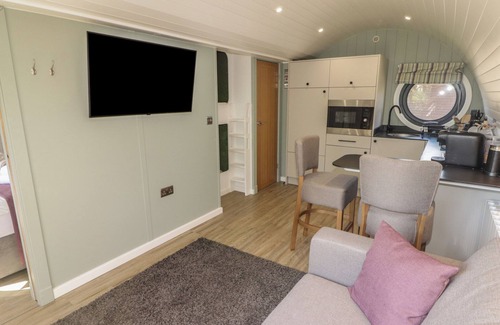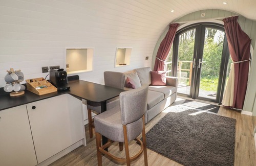 The Hazel Hobbit Pod, a single-storey shepherd's hut, consists of a open-plan layout with a kitchen with oven, hob, fridge, microwave, coffee maker, kettle, toaster, a dining area with seating for two guests, and a sitting room with TV, sofa bed and twin beds, there is a seperate king-size bedroom, all serviced by a shower room. WiFi, fuel, power, bed linen, and towels are included in the rent. Outside, there is a garden with lawn and furniture, children's play area, and off-road parking for one car. Sorry, no pets and no smoking. Within 1.9 miles you will find a shop and a pub. Your stay at The Hazel Hobbit Pod is sure to be a memorable one.