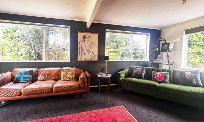 Tucked away down a drive in the heart of Oakura, lies this old style Hansel and Gretel house. All you need is to stroll up the drive and you have all the funky little cafes, restaurants, bars and 4 square at your finger tips. Or just a 5- 10 minute stroll down the road, you can soak up the beach vibes, sitting at a popular restaurant on the beach called Black Sands, sipping a cold wine or beer while watching the children play on the sand or watching the sunset. If the beach is not where you are at, you can walk a short walk and you will be at the river. Which ever takes your fancy, it is all accessible. If you are up for the surf, just down the road on state highway 45 are all the popular surf breaks.