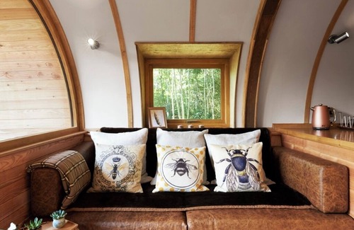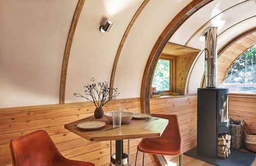 Inside, you'll find a handcrafted open-plan interior made from sustainable larch and pine, featuring a king-size bed with stunning countryside views, a fully equipped kitchen, and a cosy wood burner. There's also a spacious shower room, a full-length wardrobe, and thoughtful touches throughout.