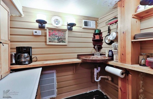 Inside, discover a Texas Cedar log, queen-size bed adorned with luxurious bedding surrounded by knotty pine walls and scored, stained concrete floors. The cozy sitting area features a sofa, recliner, desk, and a flat-screen TV.