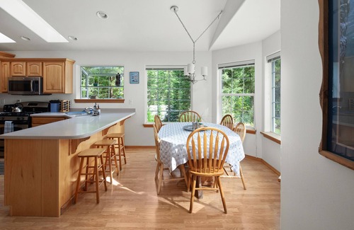 Hillside House is a bright, airy, and cheerful home located on 8 wooded acres and close to open meadows. The highway to Glacier Park less than two miles away via paved county road so you can enjoy Montana's quiet tranquility after a day of exploring. The home features a large kitchen/dining area, a living room with a gas fireplace, and a master suite with a large walk-in shower. There is a second bedroom with a queen bed and desk and the third bedroom features a bunk bed, XL single on the top and queen size on the bottom. The main bathroom has a shower and there is a powder room located off the laundry.