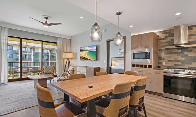 This brand new 2BR resort view suite boasts a modern 1000+ sq ft living interior, designed with a bright, open living, kitchen, and dining area and elegantly furnished throughout. With a sumptuous king-size bed in the primary bedroom, two large full beds in the guest room, and a queen-size sofa sleeper in the living area, the suite can comfortably sleep up to 8 guests.