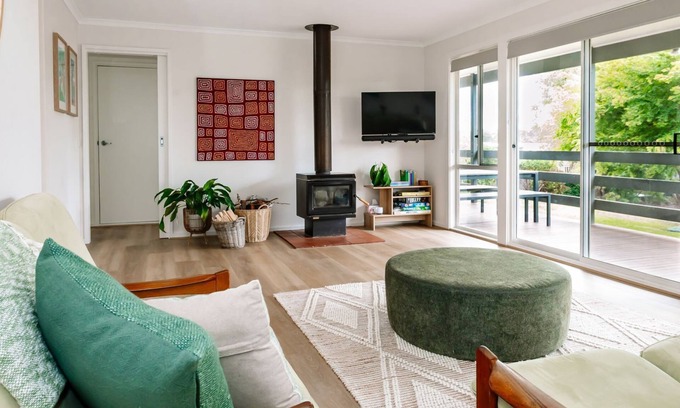 Nestled in a peaceful location just a short 5-minute walk from the charming Flinders Village, this spacious 2-bedroom holiday house provides an inviting retreat for families, friends, or small groups. With room for up to seven guests, it offers a seamless blend of comfort and convenience in an idyllic coastal setting. The lounge room serves as the heart of the house, featuring a cozy indoor fireplace that creates a warm and welcoming atmosphere. During warmer months, a split-system air conditioner ensures a cool and comfortable stay.