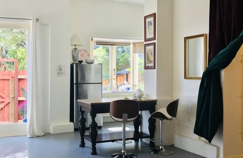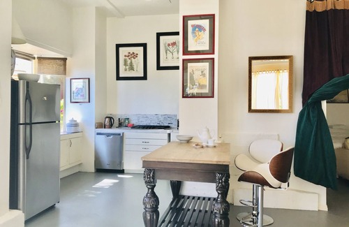 Luxuriate in this bright and airy open plan, loft style home. You’ll find nothing quite like it anywhere in Los Angeles. This is the ground level of a 4 unit building. The entire apartment is 1800 sq ft, open plan with 15 foot high ceilings. Tall windows with French doors leading to a private patio and into a very large shared garden. A large open stage area to lounge and watch TV or listen to music. Natural light filled living room where you can relax in comfort. A large dining table seats 6. A breakfast counter facing the tree filled garden with a fabulous view of the city. Fully equipped kitchen with a four ring gas stove, there is no oven however there is a toaster oven, microwave and a bbq in the private patio.