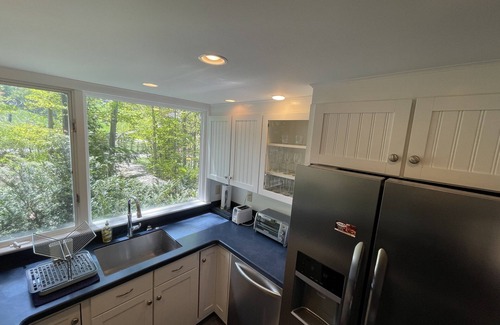 When you’re not outdoors skiing, golfing, boating, or hiking, relax and enjoy the spacious living area. Complete with vaulted ceilings, floor to ceiling wood burning stone fireplace and large windows overlooking the lake it is a wonderful place for friends and family to gather. Relax in our Buttery soft leather couches with a cozy throw. There is a flat screen television with streaming services as well as an old-style radio, Alexa and board games.