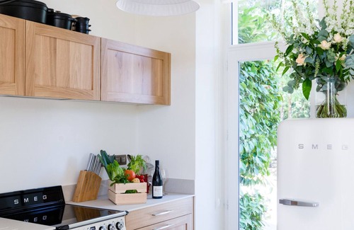 The house is composed of two levels with a living room open to the fitted kitchen on the ground floor. The kitchen is equipped with an oven, hob, dishwasher, Nespresso machine, fridge and toaster. All kitchen utensils and a welcome basket will be provided during your stay.