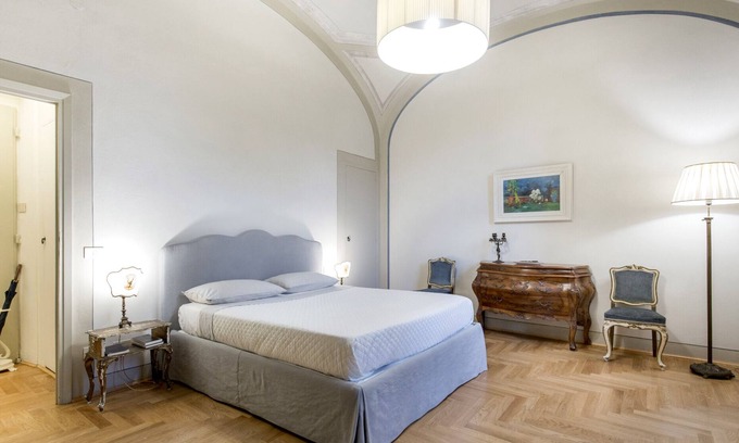 The apartment, just restored, is located in a historic Florentine building with high and frescoed ceilings, furnished with antiques and in a typically Florentine style, near the Fortezza da Basso and a very short distance from the main monuments but not in the ZTL. The apartment is very cozy, quiet because everything with internal views, revives the sensations of historic Florence. We love to live there and we would like to share this experience with our guests. It is equipped with all comforts for a pleasant and relaxing stay. Guests will always find a bottle of wine to welcome them. It features a very large bedroom and a lounge with a double sofa bed equal to a normal bed. By necessity a fifth bed is possible using an antique sofa bed which we call the princess bed.