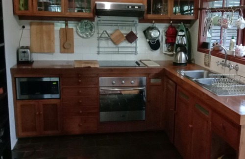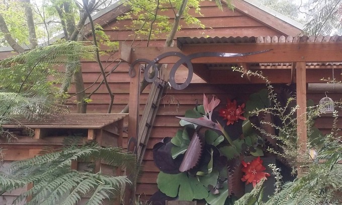 The house is surrounded by tree ferns and gums. There are no boundary fences and the back leads to the forest. Many forest creatures come out at night. Often heard and seldom seen but intriguing all the same. By day the birds are in abundance and will put on a show for you on the bird feeder. The kookaburras are at your service as a natural alarm every morning at day break.