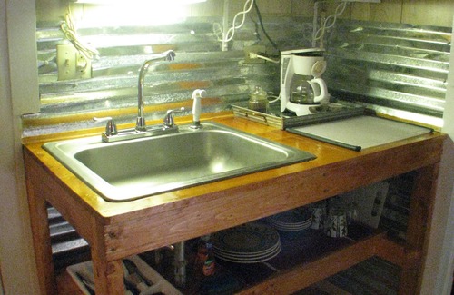 Has a microwave , toaster , fridge , some dishes, sink , and air. Enjoy the pond and all that is green and did I mention the birds...