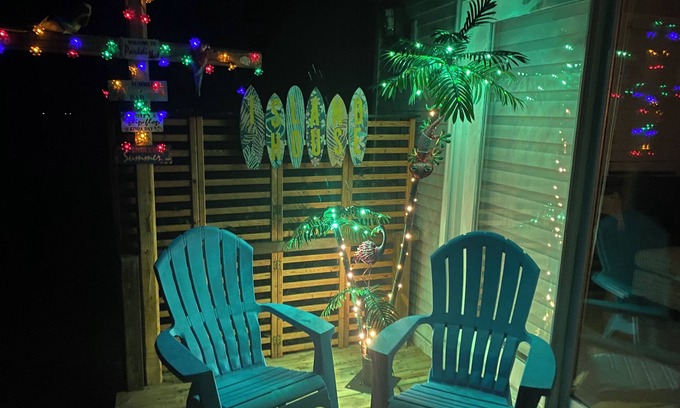 Outdoors area includes a deck, grill, fire pit & an island themed backdrop for taking photos. Fully stocked house with everything you will need for a great vacation.