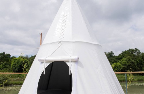 Tipi 3x3 meters (9m²) on a wooden terrace of 24m² with double bed, bedside table, dry toilet, solar water point (hand wash), 1 USB socket, solar outdoor lighting, 1 table and 2 chairs outside aperitif dinner with 1 drink included breakfast included In case of alert weather alert ORANGE declared by weather France the reservation will be automatically canceled for the safety of all.