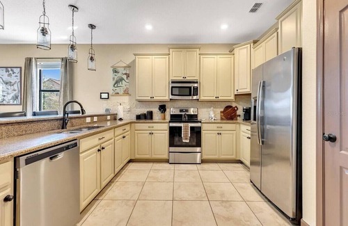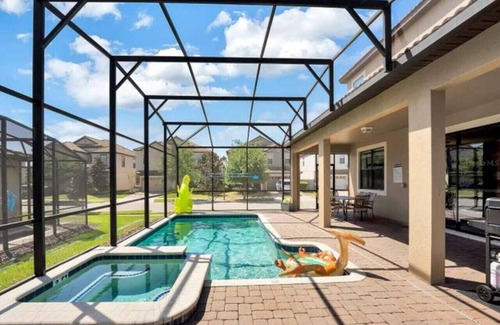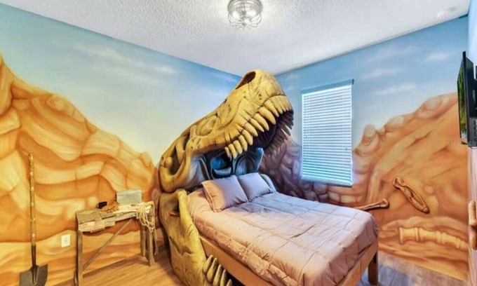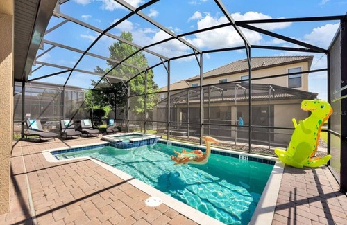 New! Welcome to... Jurassic Palace! A Jurassic Park / World dinosaur themed resort vacation home that`s also a `Dino museum`! This home sleeps 21 people, and features a private pool & spa, arcade game room, movie theater, & Dino themed bedrooms for everyone! Enjoy walking distance amenities INCLUDED at the Oasis Clubhouse, and nearby Retreat Club w/water slides, pools, lazy river, mini golf & more! Located only minutes from Disney World, Universal & all Orlando attractions Included are BOTH Championsgate Retreat Club and Oasis Clubhouse amenities! No extra fee! This private gated resort includes outstanding facilities, including the new Retreat Club water park with large water slides, two large resort-style swimming pools with tiki bar and grill, large lazy river, mini-golf, relaxing lounge chairs, fitness center, arcade, and more, providing enough entertainment without having to leave the community. Distance to Disney and other attractions: - Oasis Clubhouse: 3 blocks or 5 minute walk - Retreat Clubhouse: 1 mile - Disney`s Hollywood Studios: 12 miles - EPCOT: 12 Miles - Animal Kingdom: 12 miles - Magic Kingdom: 13 Miles - Universal Orlando: 20 miles - Epic Universe: 18 miles - SeaWorld: 17 miles - Orange County Convention Center: 18 Miles - Closest Beaches: 70 miles - OIA - MCO: 31 miles This is a truly unique and immersive vacation experience. As you enter each themed room you enter a whole new world of unique surprises, and endless fun. After you leave the theme parks, let the fun continue at The Jurassic Palace! Nine bedroom features: Downstairs: Bedroom 1 - T-Rex King size bed with smart TV and ensuite full bathroom Bedroom 2 - The Fossil queen size bed with smart TV and ensuite full bathroom Upstairs: Bedroom 3 - Aquatic King size bedroom with smart TV. (Hallway bathroom) Bedroom 4 - Volcano Queen size bedroom with ensuite shared full bathroom (bathroom shared with Dino Egg room) Bedroom 5 - Dino Egg Queen size bedroom with ensuite shared full bathroom (bathroom shared with Volcano room) Bedroom 6 - Teradactyl Queen size bedroom with smart TV. (hallway bathroom) Bedroom 7 - Jurassic Park/World bedroom with five single twin beds, four in a bunk bed and one jeep bed. (hallway bathroom) Bedroom 8 - Treehouse bunk bedroom with one twin and one full size bed, ensuite shared bathroom (bathroom shared with Dino Twin Room) Bedroom 9 - Dino twin bedroom with two twin size beds, with ensuite shared full bathroom (bathroom shared with Treehouse bunk room) - Included in bedrooms: pillows, linens and bedding, sheets, closets with hangers and shelves. Bathrooms: - Five full bathrooms - Stocked with fresh towels - Bath and/or shower - Vanity / Mirror - Toilets, toilet paper and hand soaps Living room and kitchen - Fully updated and equipped kitchen, with eat-in kitchen island table - Large dining room table attached to a relaxing family room - Keurig and drip coffee maker - Electric stove, oven, refrigerator/freezer water/ice dispenser, microwave, dishwasher, Keurig and drip coffee maker, toaster, blender, sink, hot & cold water, serving trays, glasses, silverware, pots and pans Dino themed arcade and game-room: *Under construction - photos coming soon* - Features indoor playground with pool table, pop a shot basketball and dual motorcycle racers. Dino Theater and Movie room: - Dino themed movie theater room with comfy theater seating and large movie smart TV. Covered patio and pool area: - Completely enclosed pool deck with comfortable patio furniture and outdoor dining area, screened in patio with minimal bugs and mosquitos. - Large swimming pool and spa (Additional $40 per day pool/spa heating fee) - Heated temperatures are: Pool 88 - Spa 104 *The spa only heats when the spa timer is on. The spa does not stay heated like a hot tub. Heating during the winter months is not guaranteed if outdoor temperatures are under 55 degrees. - Pool safety fence available - Sun lounge chairs - Seating and dining area with table and chairs POOL HEATING FEE = $40 per day, and must include your entire stay and must be added to reservation prior to arrival. *Pool disclaimer: Although we will set the pool and spa temperatures to 88/104, no specific regular pool temperature is guaranteed by this service. During and after cold fronts, or in winter generally when days are short, pool heaters may struggle, or even be unable to keep the water at the same temperature until the weather gets warmer. The optional pool heater service must be ordered and paid before our service personnel can turn it on. We suggest ordering pool heat prior (48 hours) to your arrival. Without optional pool heat, pool temperatures can go down to 50-60°F in December to March depending on the weather. The pool heater will help to warm up the pool faster when it gets warmer outside, however, you should not expect “bathtub temperatures” during, or after Central Florida winter cold fronts or cold nights. * Unfortunately, we are unable to activate / deactivate the pool heater on short notice or provide refunds for previously ordered pool heater service. We reserve the right to make pool heat unavailable at any time for maintenance or repairs. In case of a technical malfunction, we will refund the pool heat charge for the time the heating service was not available to you. No further credit will be given if pool equipment fails or is unavailable for any reason. POOL SERVICE: Our pool is serviced twice per week to ensure the PH is just right for our guests. Please do not be alarmed if you see someone on the patio checking or servicing the pool. Service days are typically on Monday and Thursday/Friday. HOUSE RULES: - Enjoy yourselves! :) - All trash must be placed in trash bags, and then in the bin by the front door. - DO NOT leave doors and windows open (Florida is hot, the a/c will stop working and you`ll have insects, or lizards visiting you indoors. - Accidents happen. Inform us immediately about any damage. This way we can ensure the house rema