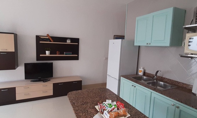 El apartamento dispone de amplia cocina-salón totalmente equipada con microondas, nevera, placa de cocina, pequeños electrodomésticos, menaje y utensilios, sofá muy cómodo y televisor con canales nacionales. Además patio privado