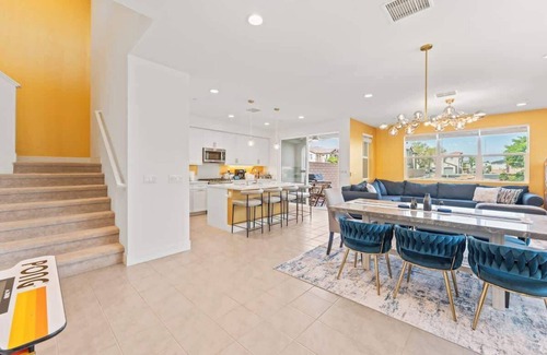 Welcome to THE PALACE, a lake-front royal retreat that sleeps 14+ making it perfect for your dream desert getaway! This newly built home on the lake offers an updated backyard with pool/spa, bbq, firepit, outdoor games, and more. The family room has a75 inch LG TV and 4 full-size arcade machines. The kitchen boasts a pizza oven and new appliances. All bedrooms are furnished with designer furniture, lighting and 55” Samsung TVs. The garage has a new, fast electric vehicle charger!