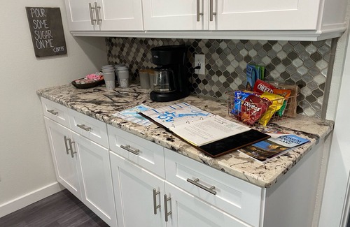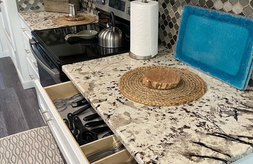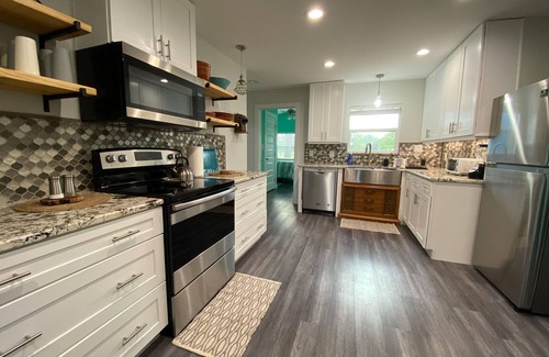 The house has 2 bedrooms, one with a king size bed and the other with a queen. It will sleep 6 if the queen sized sofa bed is used. There is also room for floor mattresses if prior arrangements are made. It also has 2 full baths, one with a shower and deep tub combo, the master offers a walk in shower next to a jacuzzi tub. A laundry room with a full size washer and dryer is off the first bathroom. The large open kitchen with its granite countertops and farmhouse sink offers appliances including an oven, refrigerator, microwave, and dishwasher as well as small appliances such as coffee maker, blender, and toaster oven. Included are dishes, silverware, cups, barware, pots and pans, tea kettle, hand mixer, knives and baking dishes. A complementary starter array of coffee, tea, and hot chocolate is provided. The large living room doubles as a dining room that seats 6. There are 2 televisions both equipped with the ability to sign in to your favorite streaming service. There is surround sound in the living room and you can connect to the system via Bluetooth to stream music inside and on the porch. WiFi is provided. There is a gas fireplace that is available for use in the colder months.