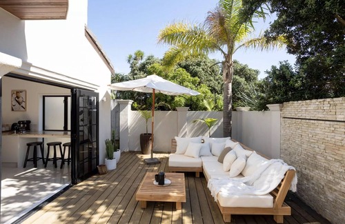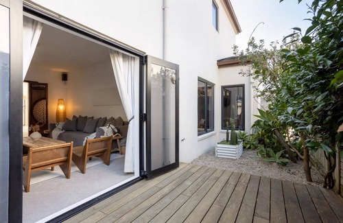 Black French doors lead to a generously sized deck, blurring the boundaries between indoor and outdoor spaces. Here, a luxurious outdoor lounge suite beckons for daytime snoozing or cloud-watching.