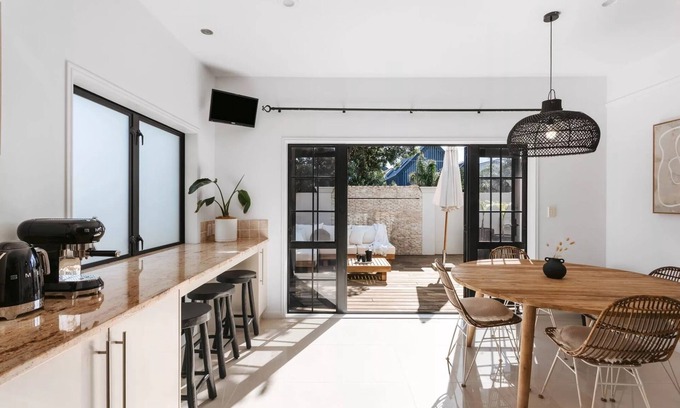 As you step inside, the thoughtfully curated details of modern fixtures, natural timber furnishings, and earthy tones create a welcoming ambiance across two levels. The open-plan kitchen and dining area, adorned with a glossy, light-tilted floor, exudes brightness and warmth. The kitchen, equipped with top-notch appliances including a Smeg coffee machine, invites you to savor every moment of your stay. The breakfast bar adds an extra dimension, providing ample seating for your group to come together.