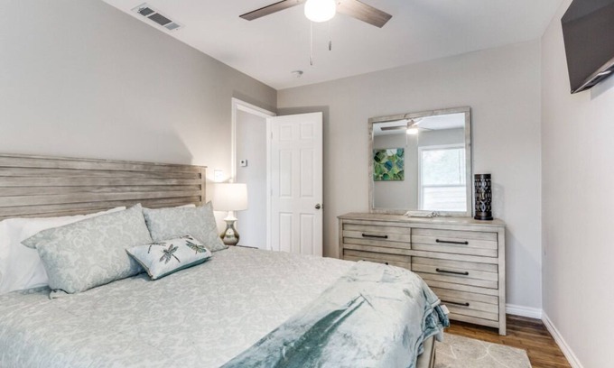 A beautiful transitional home. This home is peaceful and perfectly-located. Walking distance to the famous Granbury square. The beach is 1/2 mile away. Large back yard is spacious for grilling, smores, and fun. Side yard is perfect for a play area. The garage has a game room with a pool table, shuffleboard, and T.V. with comfy seating. Each room as a TV.