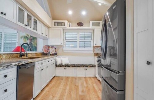 Step inside and you’ll appreciate the beautiful hardwood floors, vaulted ceilings, and opulent coastal decor, all with a feels-like-home vibe. The open layout invites you to relax and unwind yet also feel pampered and luxurious, both in equal measure. A well-appointed kitchen flows effortlessly into a lovely dining room which comfortably seats six. Your living room offers an ideal spot for connecting with friends and family and includes so many little extras such as books, games and even a piano. With three comfortable bedrooms down the hall, your guests may never want to leave. The primary bedroom boasts and en suite bathroom while the second and third bedrooms offer a King bed and Queen bed + office area, respectively. The lush backyard and pool deck includes a large hammock, outdoor wood burning fireplace, plenty of seating/umbrellas for shade, and so much more. The large, heated pool is surrounded by tropical landscape and privacy fenced for an added layer of peaceful exclusivity. While the home is raised for great views and safety, an elevator makes access to the main level effortless and stress free.