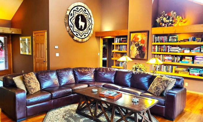 The Lodge has an open floor plan with soaring, vaulted ceilings in the great room, yet remains a warm and inviting home away from home. The great room has access to a multi-level, spacious main deck and a secondary smaller deck off the master bedroom. Windows line three walls of the great room looking out onto the lake, making this space perfect for wild life viewing and watching the gorgeous sunsets. An extraordinary fieldstone, double sided fireplace, hickory floors, a comfortable leather sectional and a baby grand piano make this room so inviting it will be hard to leave!