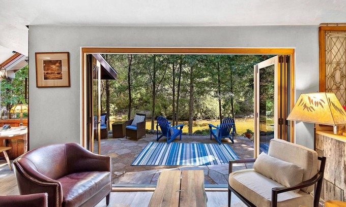 Enjoy and relax in this refurbished lodge on the Carmel River. Expansive views from every window captures the river as it meanders in harmony with the redwoods, sycamores and the ducks that inhabit this natural setting.