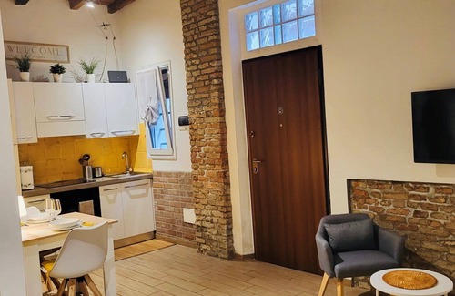 Housed in a fifteenth century building that overlooks Piazzetta San Michele, the loft has private access from the Street of Duels, one of the oldest streets of the old town, little known to them Ferrara, the incredible scene of accounts adjustments at the time of Alfonso II D'este. The apartment consists of a single room of 35sqm has been cleverly divided into living and sleeping areas.