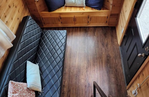 The Log Cabin provides the full Rocky Mountain tiny home experience. From its fun cabin décor to its warm cozy interior, this tiny home has it all. The bathroom features a tub for relaxing after a long days’ hike, a flushing toilet, and sink. The Kitchenette is aptly furnished with a propane gas stovetop and oven and includes a ¾ size refrigerator. The home stocked with linens, dishes, utensils, and cookware for your stay.
