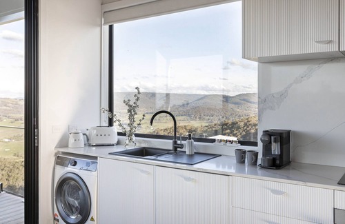 The Lookout is a luxe farm lodge which includes an Outdoor Bath , Fire Pit, Indoor fireplace, stunning pitched roof Tasmanian Oak lined ceiling.
