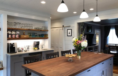 The farmhouse house was originally built circa 1849 by a Dutch family with the surname of Losee (pronounced Lucy). Between 2018 and 2019, our family was able to completely remodel the home, working to preserve and reuse as many original features as possible. Wood floors were saved downstairs and partly upstairs, while furniture pieces (shelves, end tables, coffee table, bar table and TV console) were custom built from original floor joists, stair stringer and