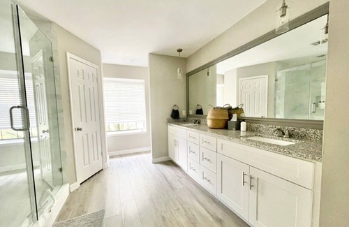 This large suburban home is set on a quiet street. The main floor has high ceilings with a cozy living room, dining area with a full kitchen. The kitchen will have everything you'll need for a meal. The main bedroom with a king bed is found on the main floor as well. The roomy, updated bathroom is luscious.