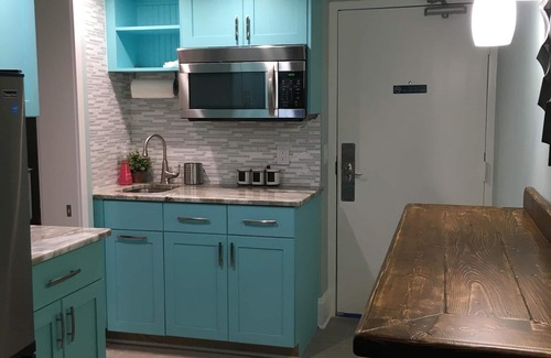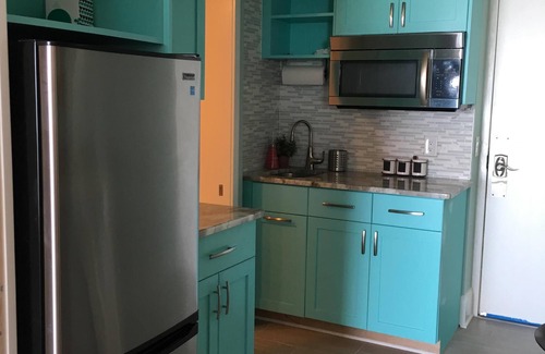 The kitchenette has a full microwave, full refrigerator/freezer, a single induction cook top along with pots and pans, cutlery, crockery and glassware. It has a toaster, a Keurig, coffee maker and blender.