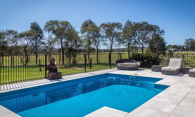 Surrounded by sweeping rural landscapes, it's the kind of place where time slows down and every moment feels made just for you. Whether you're seeking a romantic weekend or a mid-week reset, this Hunter Valley farm stay invites you to unwind your way. Start your mornings with coffee on the patio as kangaroos graze nearby, spend the afternoon soaking by the pool, and finish the day curled up by the fire with a glass of local wine.