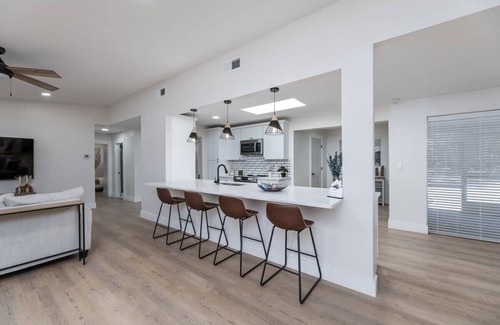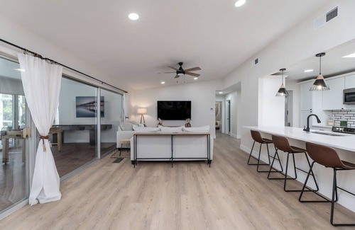 The entire manor is your retreat from the world while you’re our guest! Just minutes to St. Augustine’s historic district, but in a quiet residential neighborhood with free parking. With three bedrooms, seven beds (plus an air mattress and a pull out couch), three baths, open plan living space, and a spacious back lanai for al fresco dining and enjoying the beautiful weather, plus games and a heated pool to elevate your stay! You’ll have everything you need for a fun and relaxing visit, with the beach, historic sites and tons of dining options within a few minutes drive.