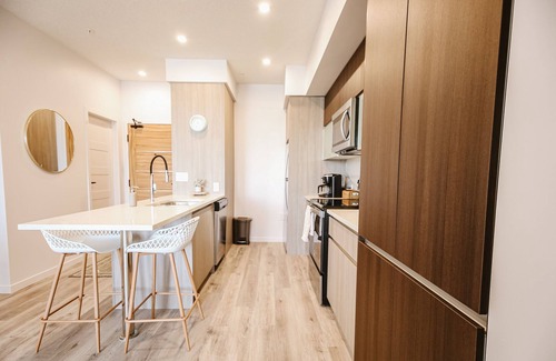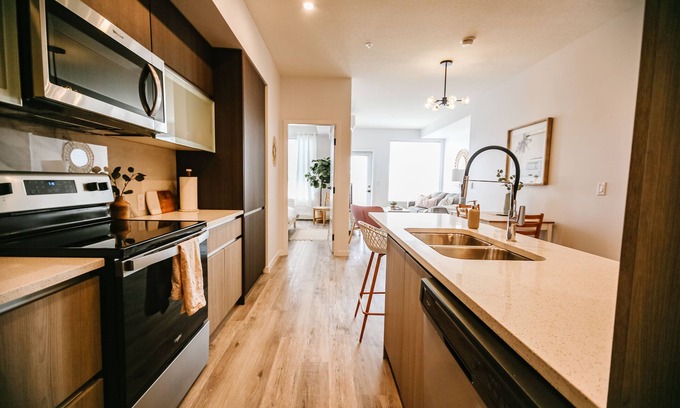 If you are looking for that clean and contemporary 2-bedroom condo, then look no further! This stylish condo features a beautiful kitchen with quartz counter tops and stainless steel appliances. Large windows in the suite for all the natural sunlight. Spacious bedrooms with queen beds and in-suite laundry. This building is brand new, and is beautiful! Other amenities in the building feature underground parking, fitness center, outdoor pool and bocce ball, foosball table, pool table, dog and cat runs etc. Centrally located in Saskatoon and close to ALL amenities, this is the perfect spot for your next trip to the city!