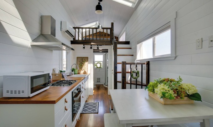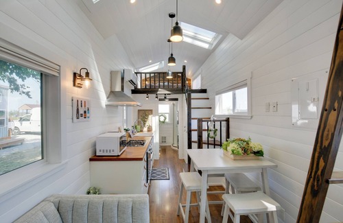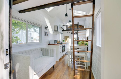 TINY HOME LIVING: Deck, Adirondack chairs, charcoal grill, fire pit (wood not provided), indoor & outdoor dining areas