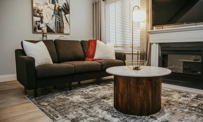 Guests first enter the home through the front porch, which allows plenty of space for shoes, coats and other gear. Through the living room, you'll find two full size couches in a nice conversation setting, as well as a fireplace and 58" smart TV.