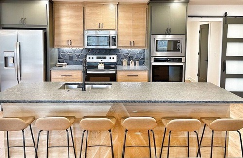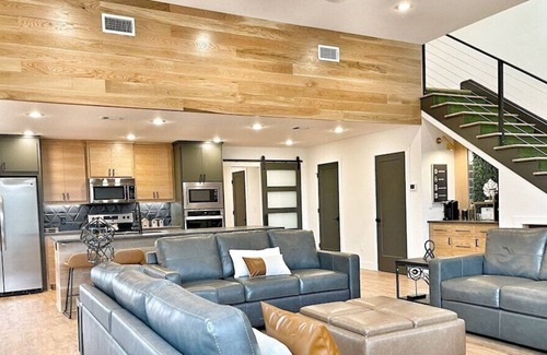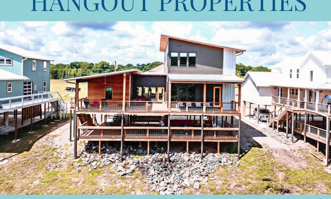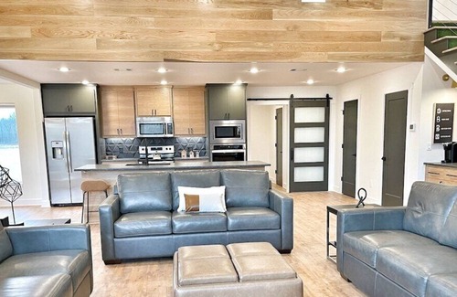 Experience ultimate luxury on the river in this plush modern home featuring five bedrooms and six baths. Relax in one of four king master suites or stay up late with friends playing games and ping pong in the game room. Or Spread out in the bunk room housing three queen and three twin-sized beds. Enjoy spectacular views from two balconies just above riverside, as well as outdoor dining tables perfect for al fresco meals courtesy of a fully stocked kitchen outfitted with not only two islands but also its own coffee bar! And when you're done eating, take some time to relax at any number of amenities available such as hammock by the riverfront, comfy furniture outdoors, cornhole games and more.