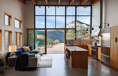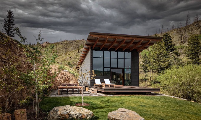 Welcome to The Mountain Lookout, a tranquil and luxurious escape nestled in the mountains of Boulder, Colorado. This modern cabin is the ultimate getaway for couples and individuals seeking seclusion, tranquility and inspiration. With a 17-foot-tall glass wall, the home is designed to immerse you in stunning panoramic views, whether you're lounging in the living room or waking up in the bedroom.