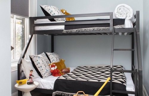 A refreshing, sophisticated oasis with added flare like vibrant, oversized works of Chicago memorabilia. Ideal for a family or group of friends, this suite sleeps 6 between 1 Queen Bedroom + 1 Bunk Bed Bedroom + Queen Sleeper & 2 full bathrooms. A stocked kitchen is on hand to cook a meal (or simply request a chef, you’re on vacay after all) and serene bathrooms complete with luxury bath products feels like home. Yoga mats aid a good sweat while your own washer + dryer keep things fresh. Sleep6 brand mattresses and supple linens allow for an optimal night’s rest. A washer + dryer, Sonos, YouTubeTV, and fast Wi-Fi add to the ease and comfort. Don't forget to enjoy your morning coffee outside with direct access to the courtyard!